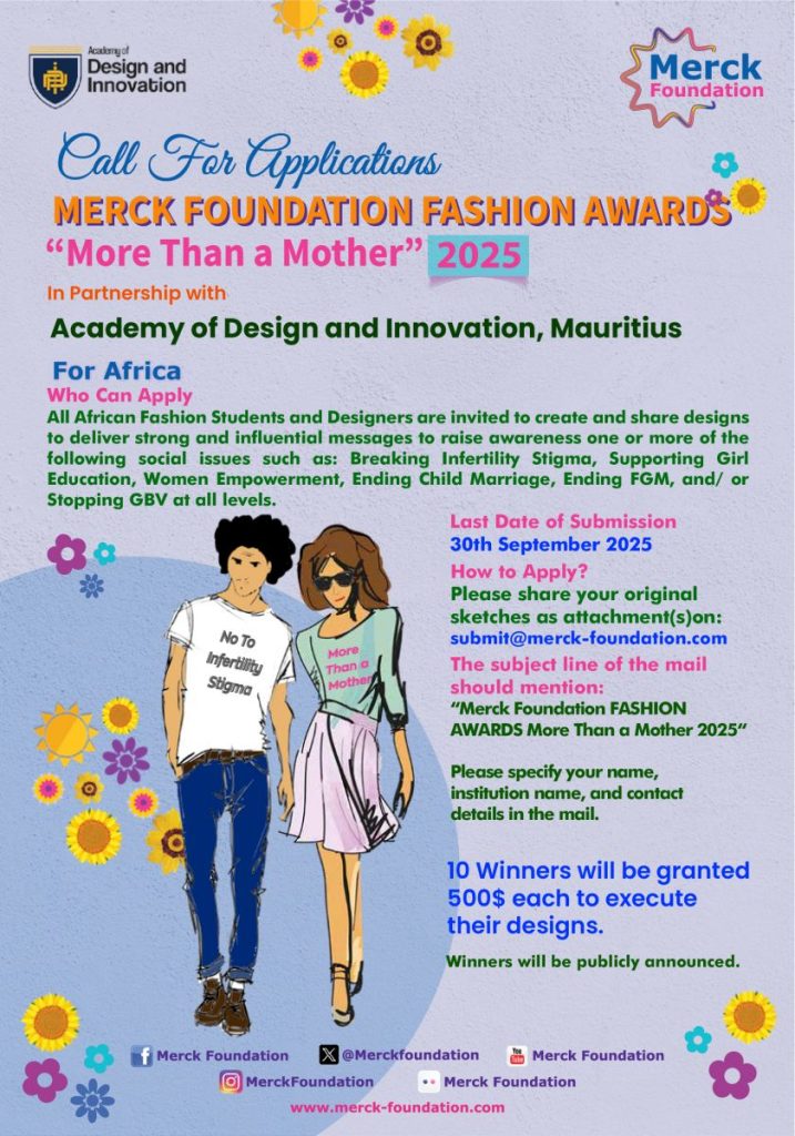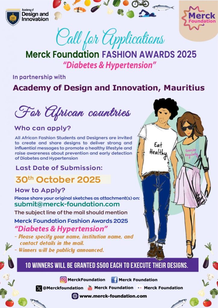 Merck Foundation Fashion Awards 2025 “Diabetes & Hypertension”, in partnershipwith Academy of Design and Innovation, Mauritius: All African Fashion Students and Designers are invited to create and share designs to deliver strong and influential messages to promote a healthy lifestyle and raise awareness about the prevention and early detection of Diabetes and Hypertension.