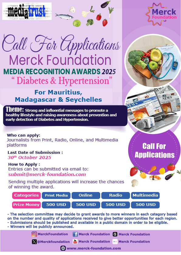 Merck Foundation Media Recognition Awards 2025 “Diabetes & Hypertension”, in partnership with Media Trust Board, Mauritius: Media representatives are invited to showcase their work through strong and influential messages to promote a healthy lifestyle and raise awareness about the prevention and early detection of Diabetes and Hypertension.