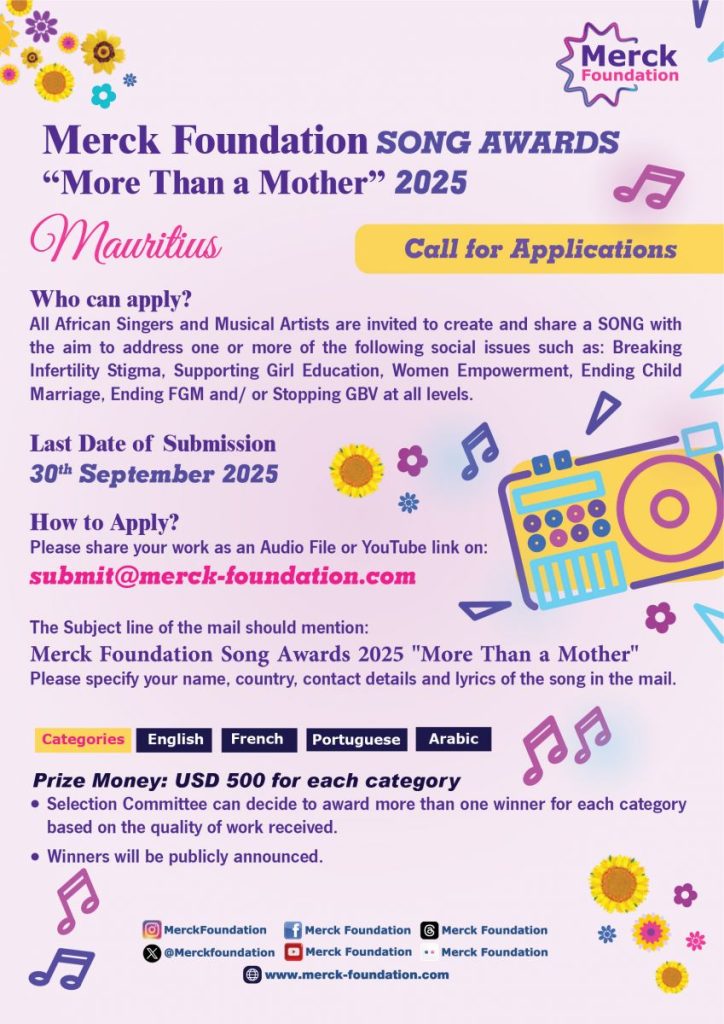 Merck Foundation Song Awards “More Than a Mother” 2025: All African Singers and Musical Artists are invited to create and share a SONG with the aim to address one or more of the following social issues such as: Breaking Infertility Stigma, Supporting Girl Education, Women Empowerment, Ending Child Marriage, Ending FGM, and/ or Stopping GBV at all levels.