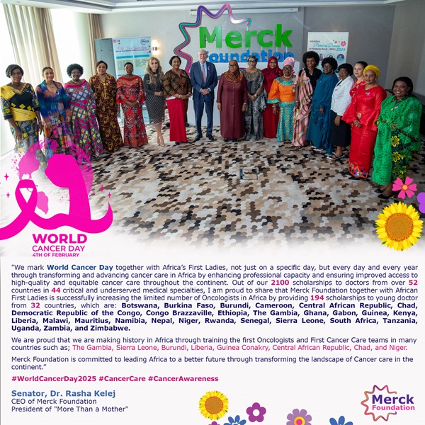 - At Merck Foundation World Cancer Day not just as a single day, but as our continued commitment to transform and advance cancer care in Africa. Together with my dear sisters, the Africa’s First Ladies, we have enhanced the cancer care capacity in the continent by providing 194 scholarships to young African doctors from 32 countries, significantly increasing the number of oncologists in Africa. We are making history together by providing these important scholarships for the first oncologists and/or the first cancer care teams in many countries across Africa.