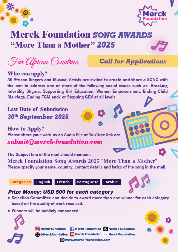 - Merck Foundation Song Awards “More Than a Mother” to address one or more of the following social issues such as: Breaking Infertility Stigma, Supporting Girl Education, Ending Child Marriage, Ending FGM, Stopping GBV and/ or Women Empowerment,